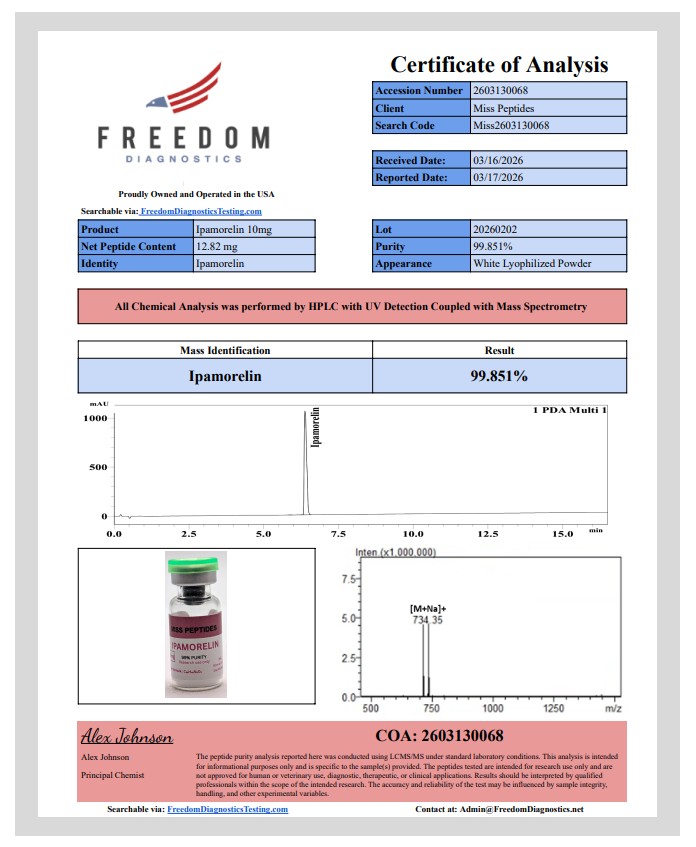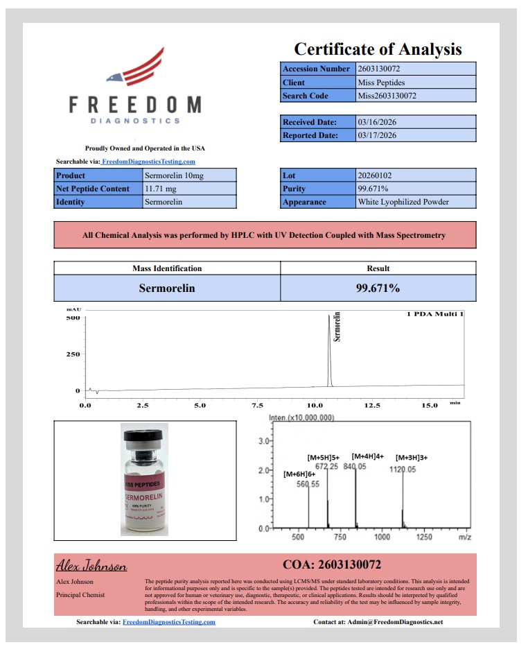 Our Lab Tests and Certificates of Authenticity Semaglutide Certificate of Authenticity Download PDF GLOW BPC-157 Blend Certificate of Authenticity Download PDF Semiglutide Certificate of Authenticity Download PDF CJC-1295 Certificate of Authenticity Download PDF Ipamorelin Certificate of Authenticity Download PDF Sermorelin Certificate of Authenticity Download PDF NAD+ Certificate of Authenticity Download PDF Retatrutide COA Certificate of Authenticity Download PDF